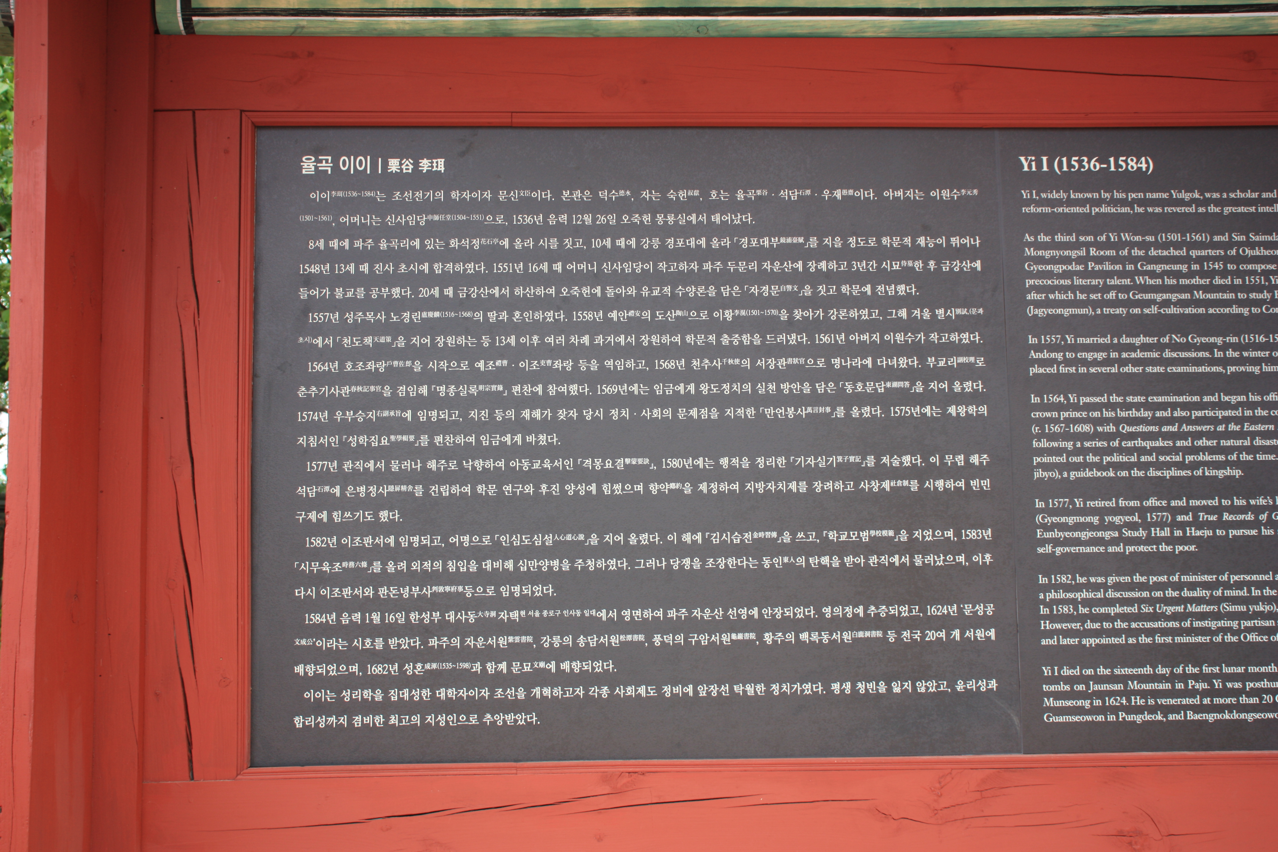 이이(1536~1584)는 조선전기의 학자이자 문신이다. 본관은 덕수, 자는 숙헌, 호는 율곡 • 석담 • 우재이다. 아버지는 이원수(1501~1561), 어머니는 신사임당(1504~1551)으로, 1536년 음력 12월 26일 오죽헌 몽룡실에서 태어났다.