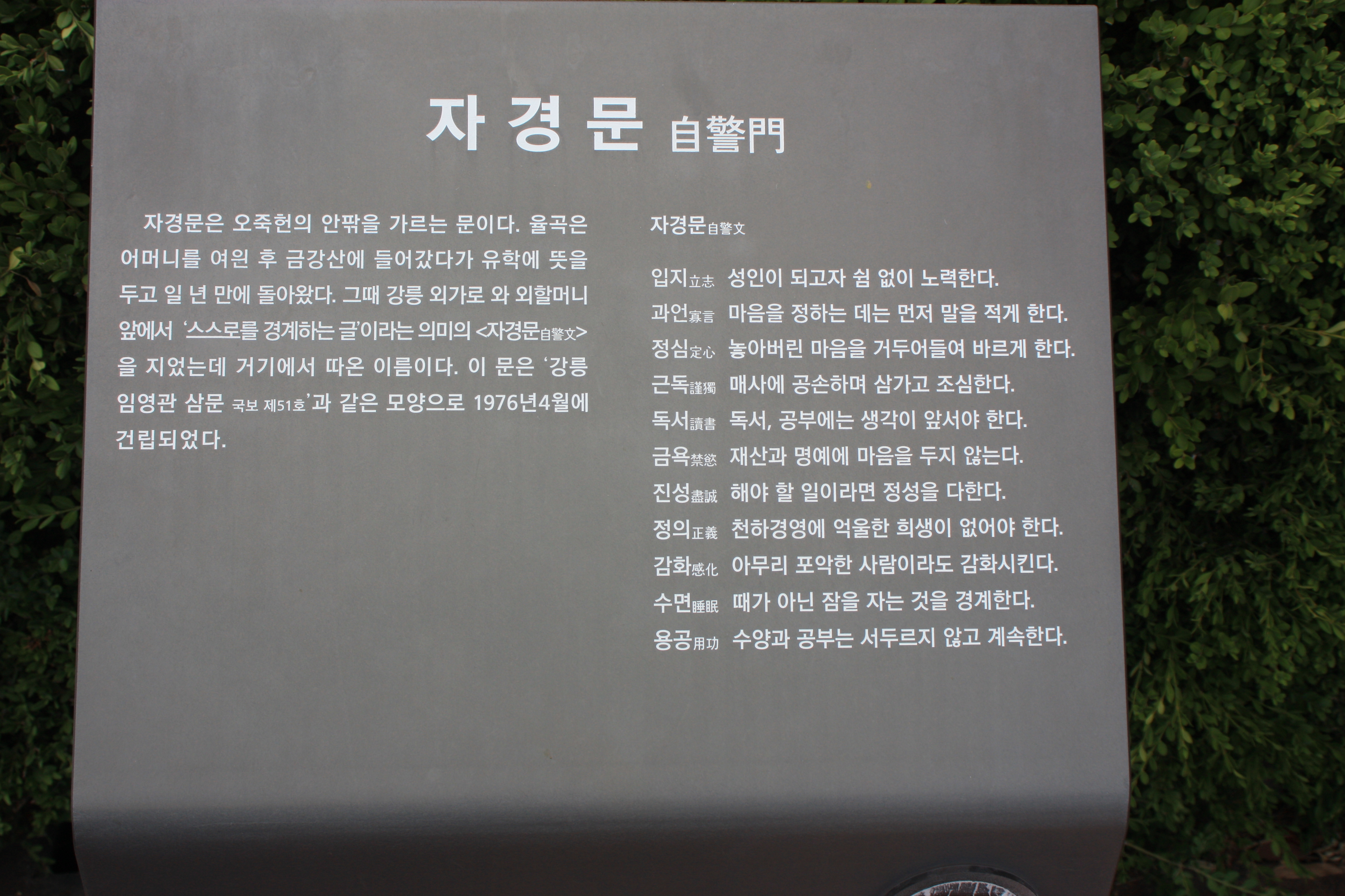 자경문은 오죽헌의 안팎을 가르는 문이다. 율곡은 어머니를 여읜 후 금강산에 들어갔다가 유학에 뜻을 두고 일 년 만에 돌아왔다. 그때 강릉 외가로 와 외할머니 앞에서 '스스로를 경계하는 글'이라는 의미의 <자경문> 을 지었는데 거기에서 따온 이름이다. 이 문은 '강릉 임영관 삼문 (국보 제51호)'과 같은 모양으로 1976년4월에 건립되었다.