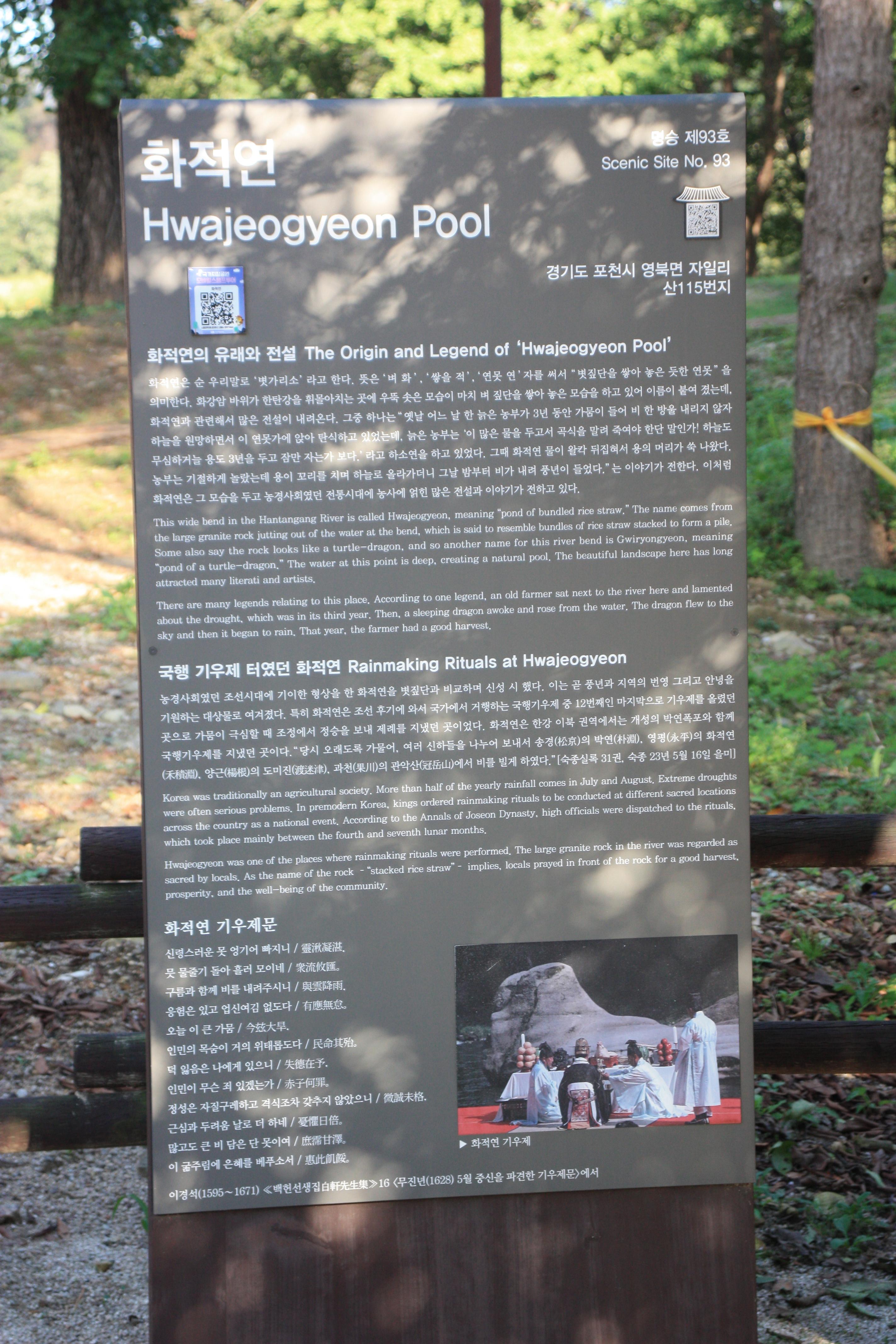 화적연은 조선시대에 제일 마지막 순서로 국행기우제를 지냈던 영험한 장소이고 "용"에 대한 전설이 구전되고