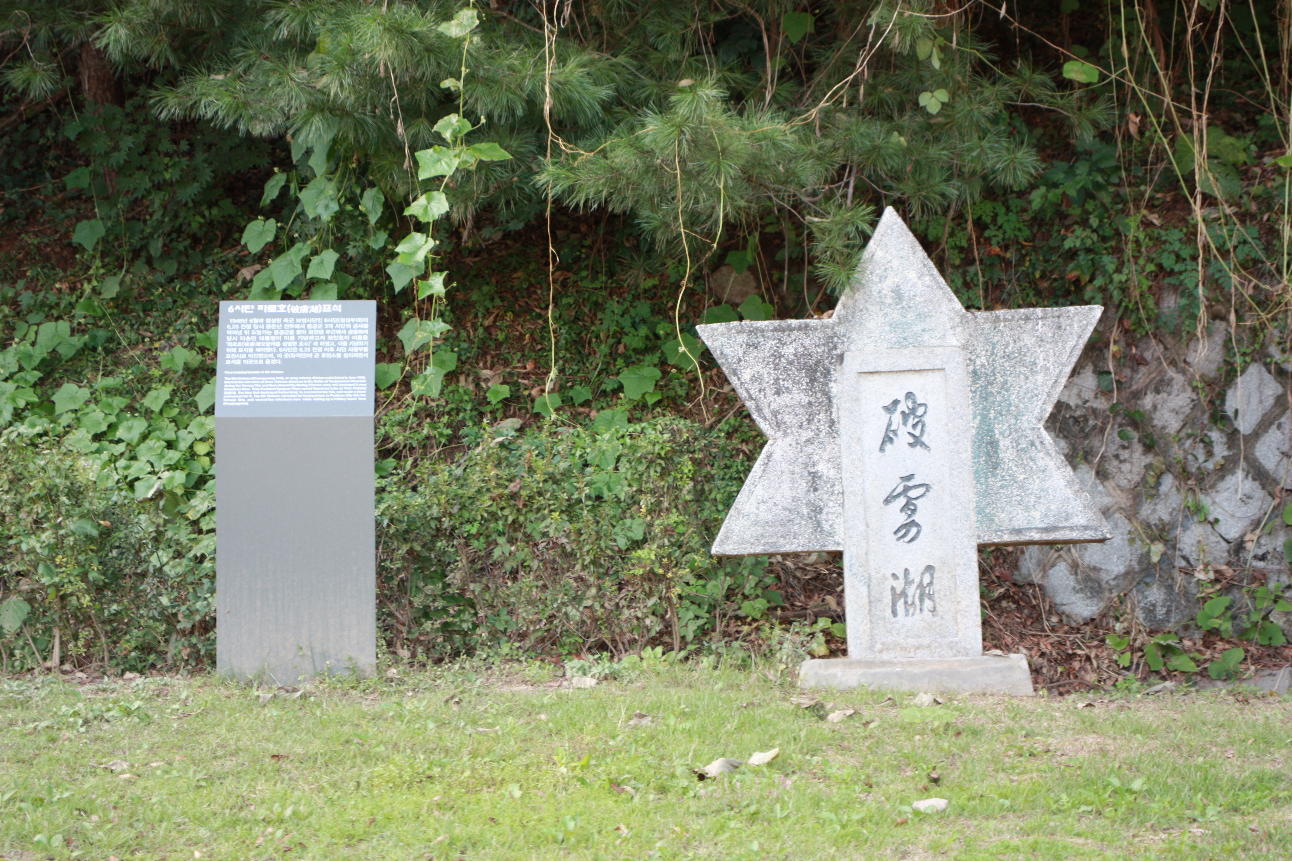 '파로호(破膚湖오랑캐를 섬멸한 호수)' 라 하였고, 이를 기념하기 위해 표석을 제작했다.