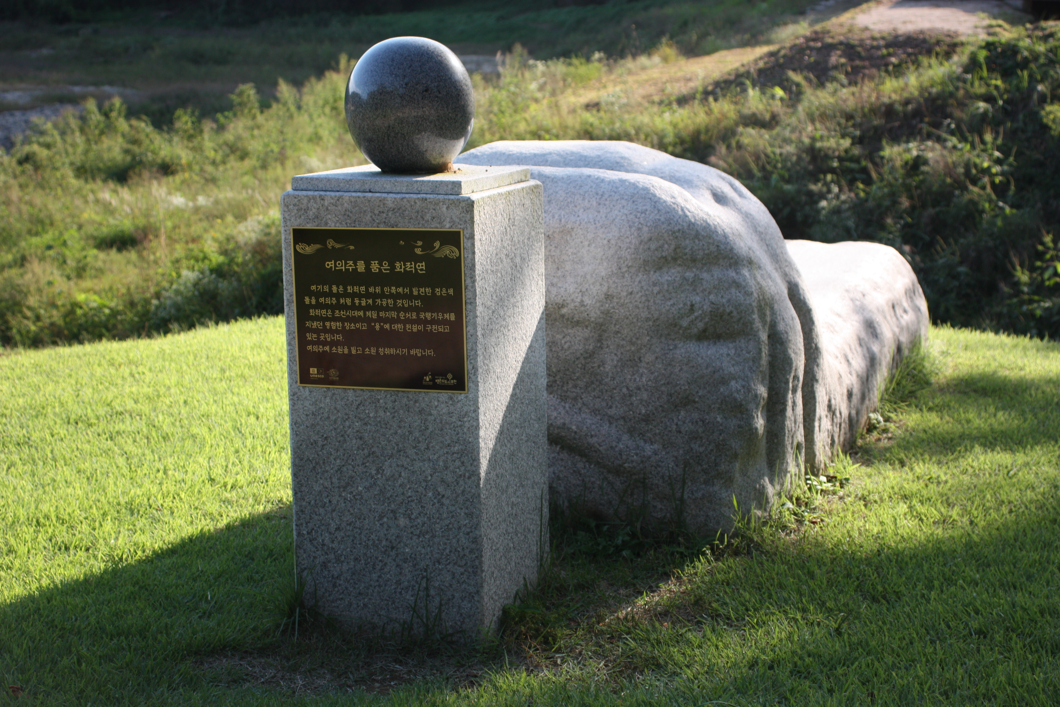 여기의 돌은 화적연 바위 안쪽에서 발견한 검은색 돌을 여의주 커럼 둥글게 가공한 것입니다.